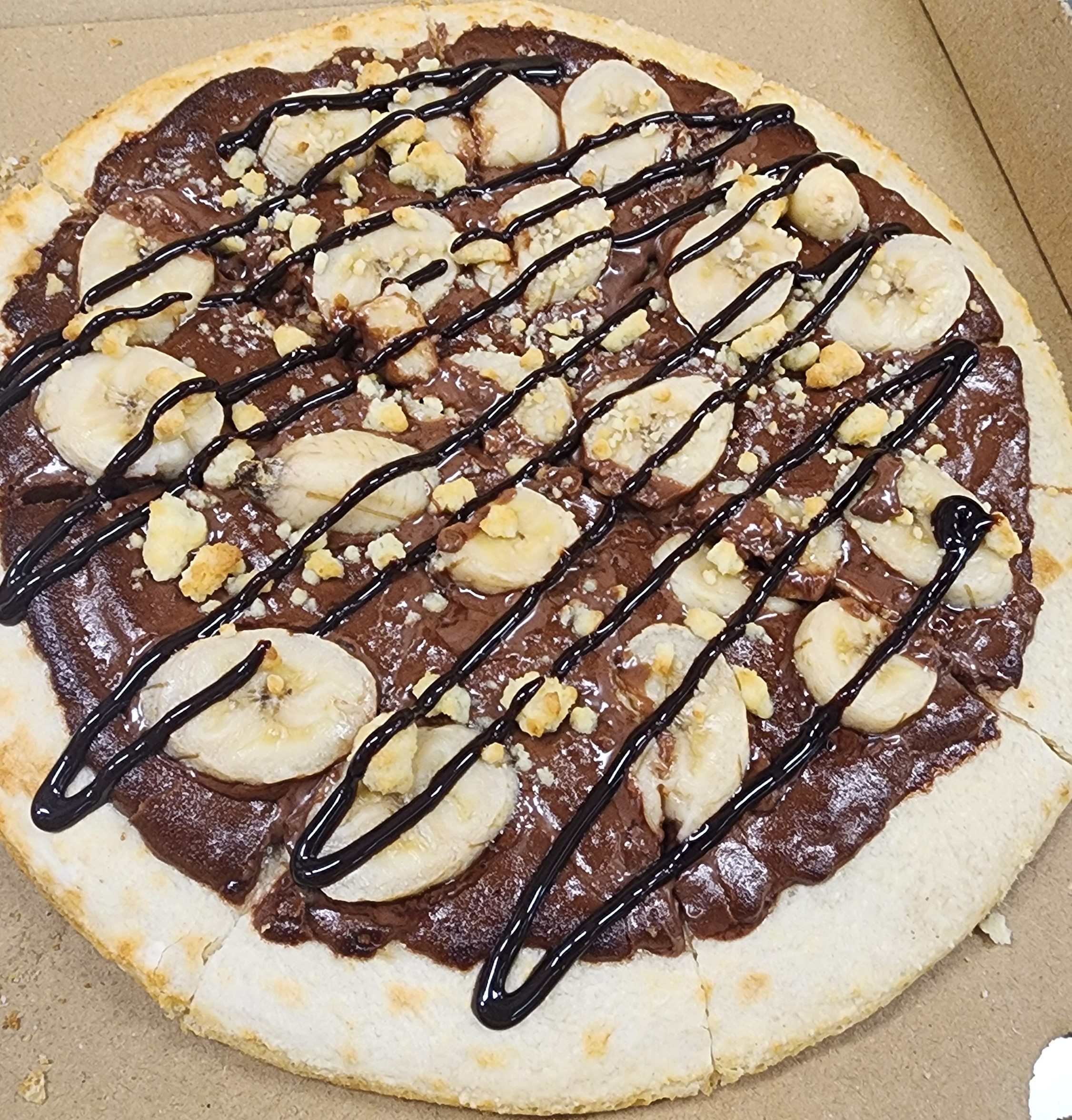 KIT KAT PIZZA - Banana$25KITKAT® spread with its perfect blend of the rich high-quality chocolate and crispy wafer pieces, sliced banana, streusel crumbs & choc fudge sauce×